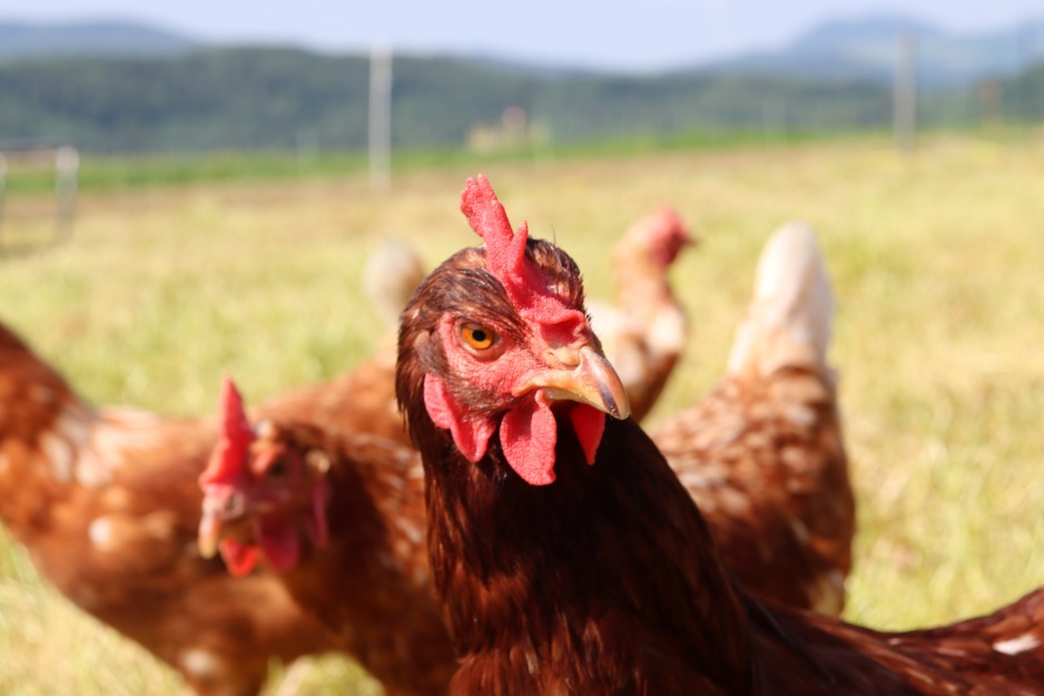 Gehalten werden die Hühner in der Freilandhaltung in einem Hühnermobil.